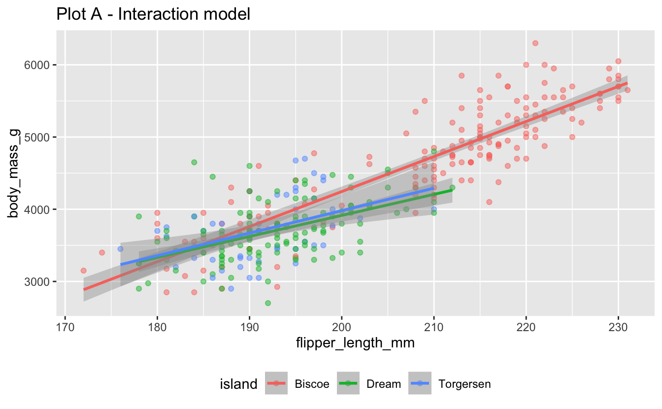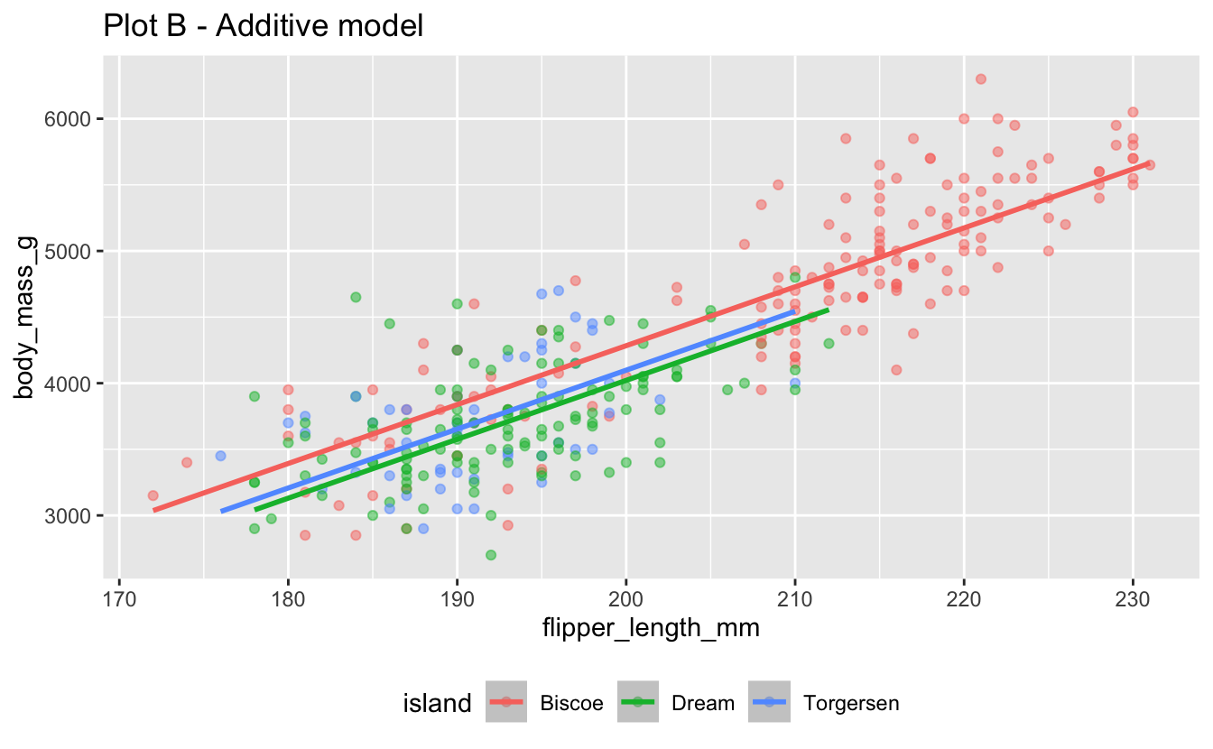 - Look back at Plot B. What assumption does the additive model make about the slopes between flipper length and body mass for each of the three islands?