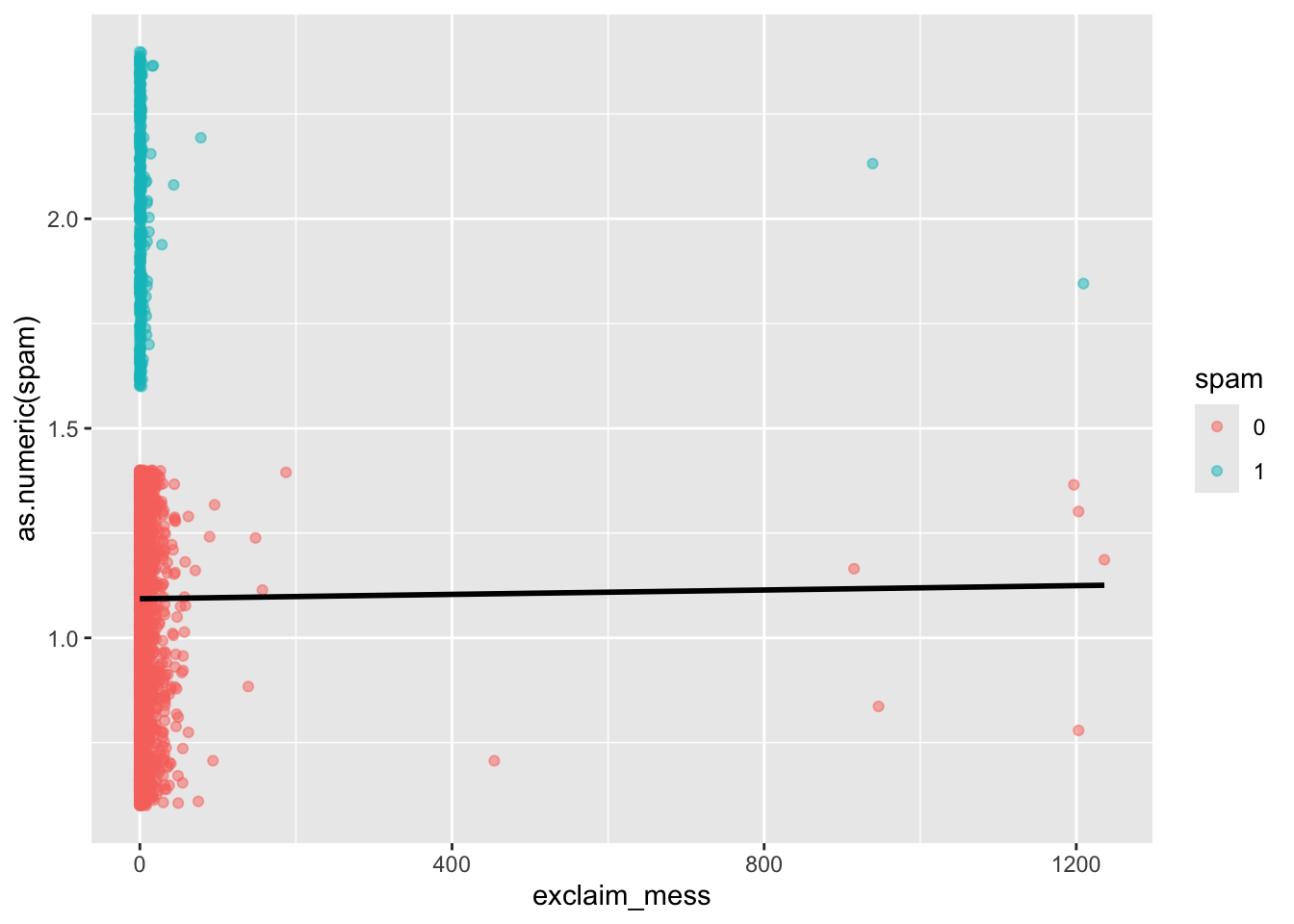 ggplot(email, aes(x = exclaim_mess, y = as.numeric(spam), color = spam)) +