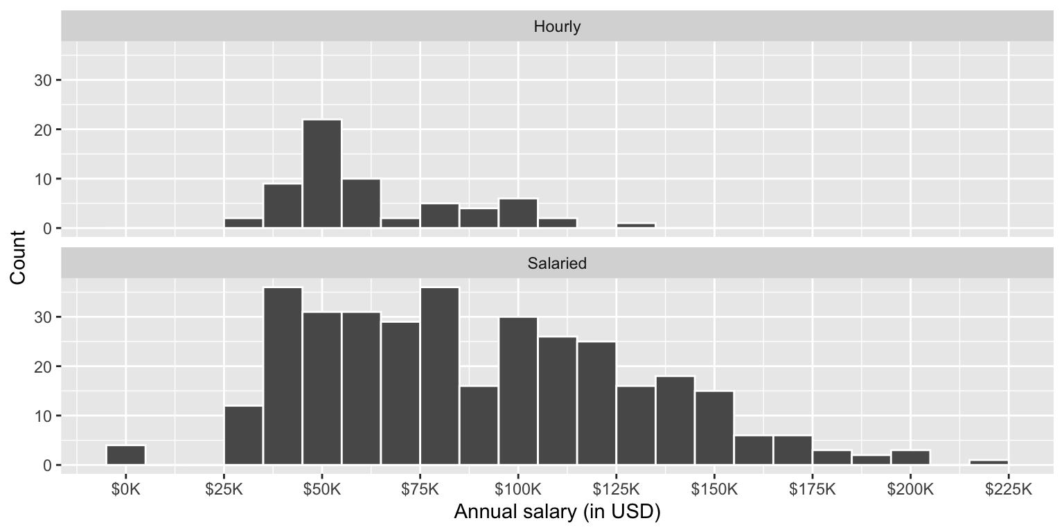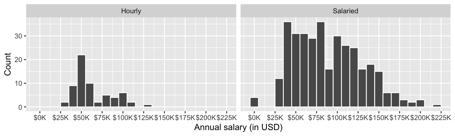 Figure 1 (a) and Figure 1 (b) show the distributions of annual salaries of hourly and salaried workers. The two figures show the same data, with the facets organized across rows and across columns. Which of the two figures is better for comparing the median annual salaries of hourly and salaried workers. Explain your reasoning.