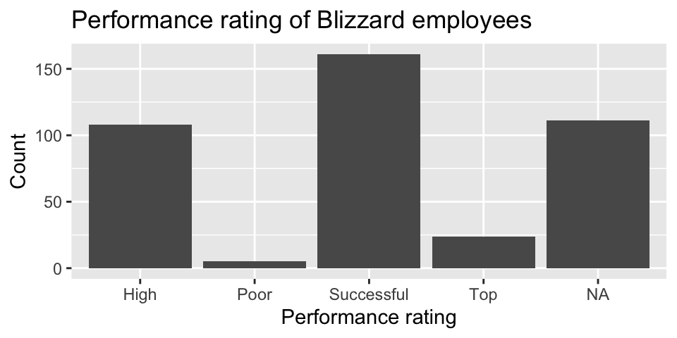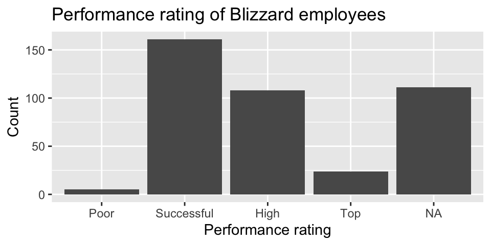 Suppose you made the bar plot shown in Figure 2 (a) to visualize the distribution of performance_rating