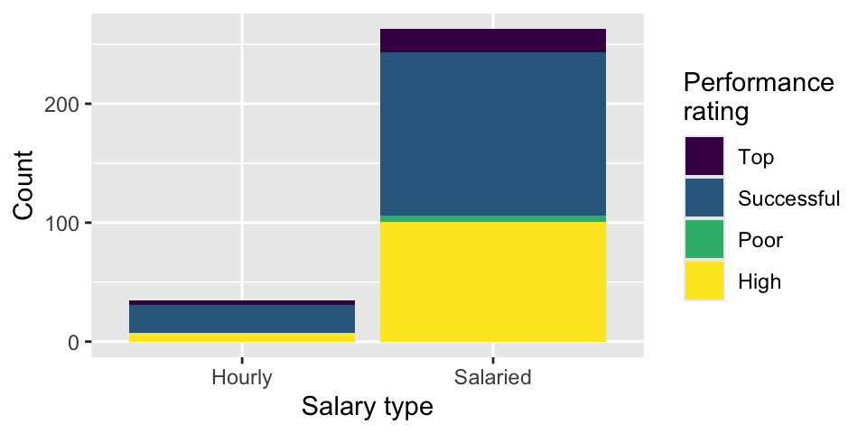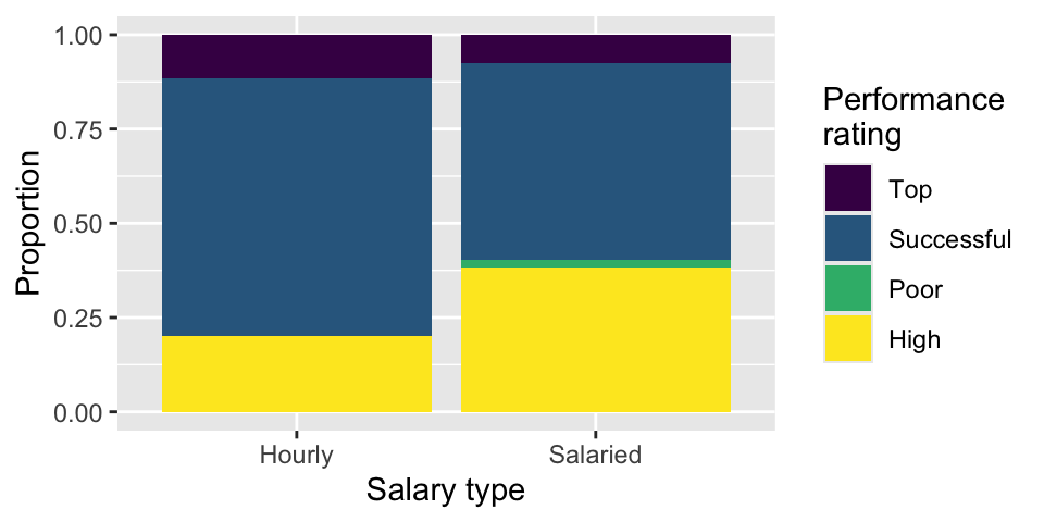 Question 8: Your teammate asks you for help deciding which one to use in the final report for visualizing the relationship between performance rating and salary type. In 1-3 sentences, can you help them make a decision, justify your choice, and write the narrative that should go with the plot?