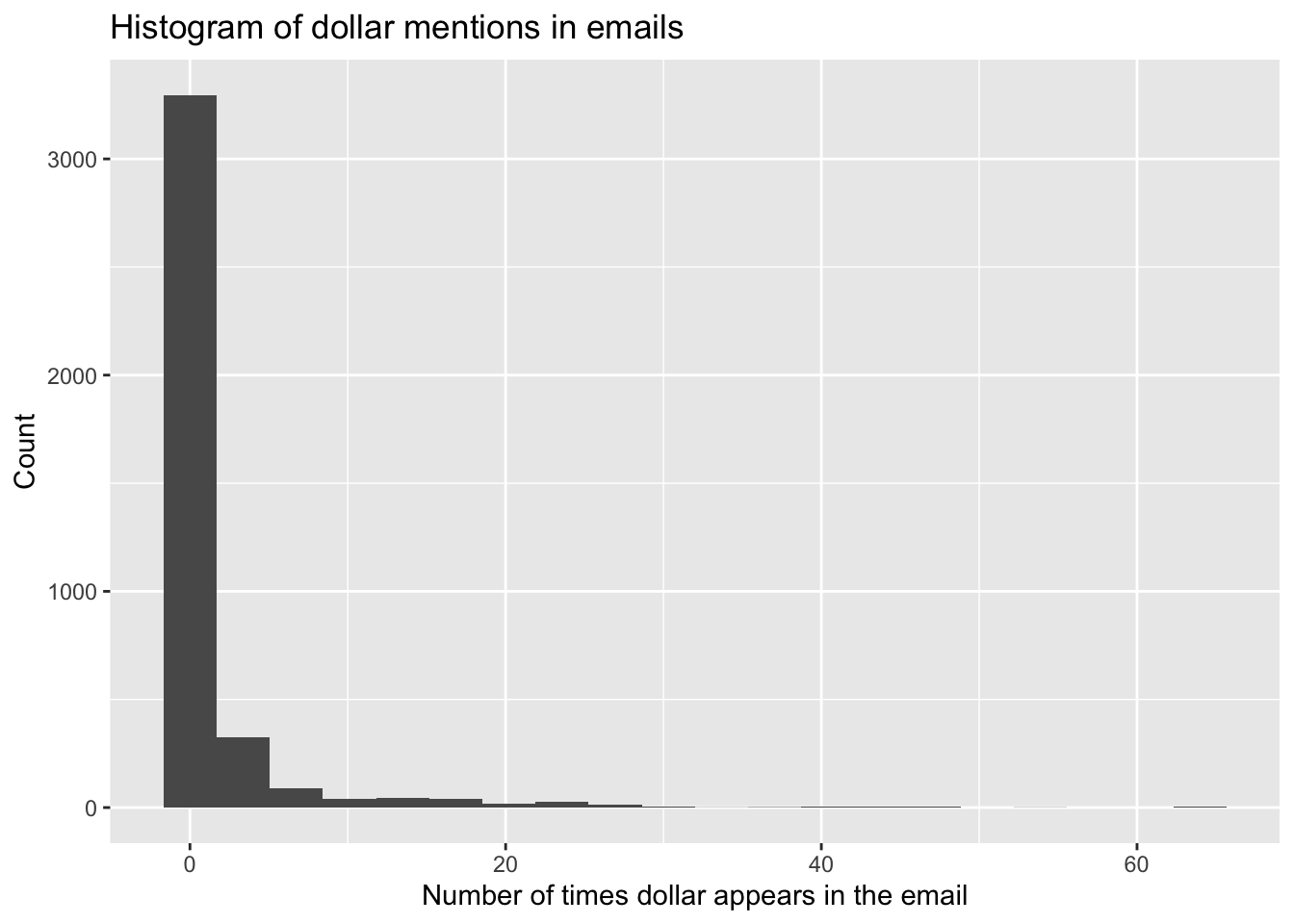 title = "Histogram of dollar mentions in emails",