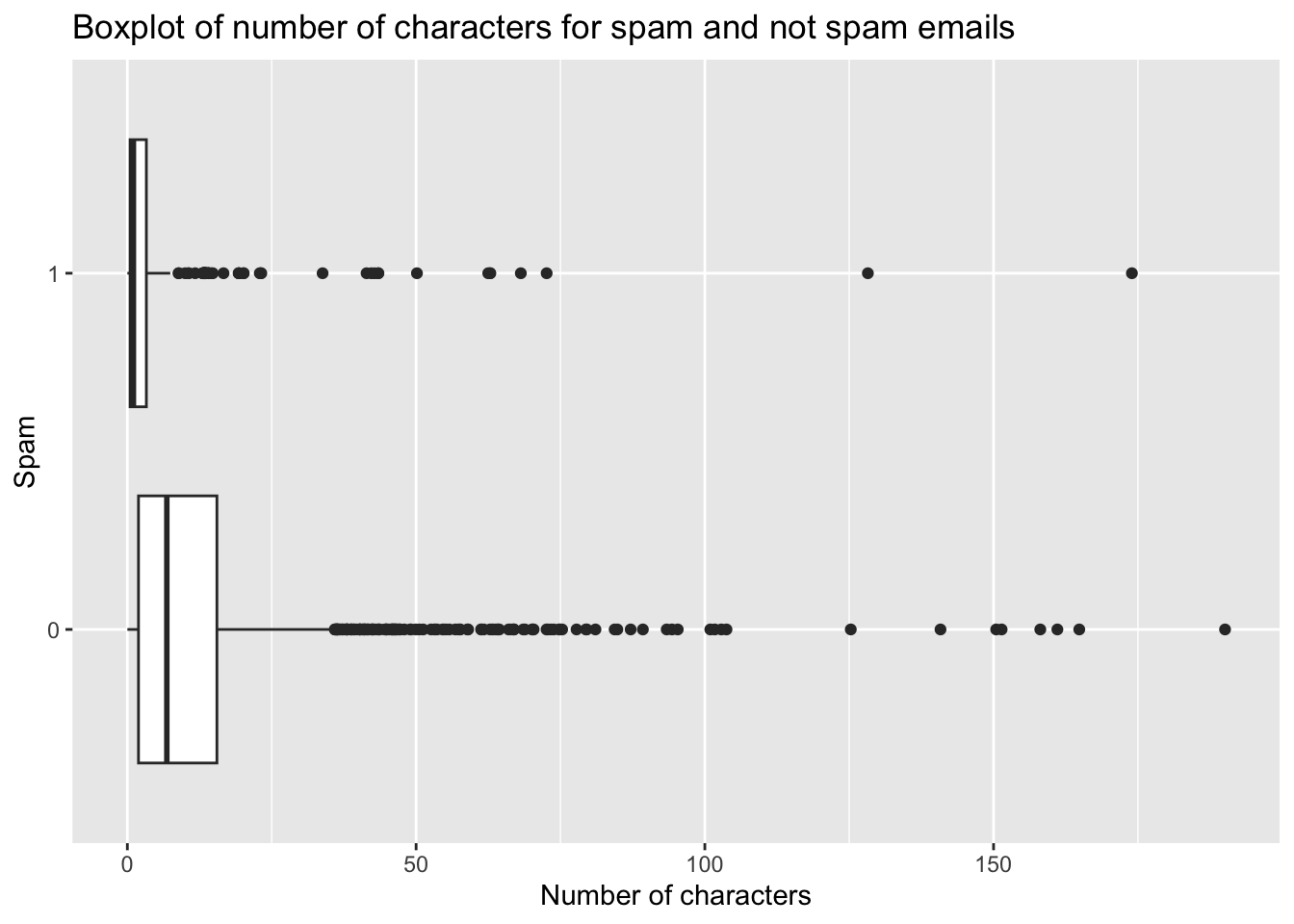 title = "Boxplot of number of characters for spam and not spam emails",