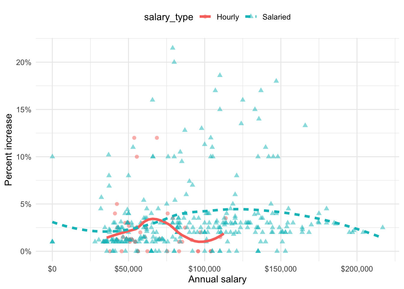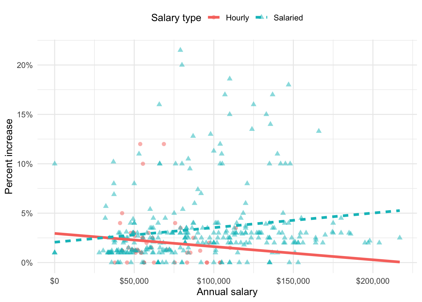 percent_incr: Raise given in July 2020, as percent increase with values ranging from 1 (1% increase) to 21.5 (21.5% increase)salary_type: Type of salary, with levelsHourlyandSalariedannual_salary: Annual salary, in USD, with values ranging from $50,939 to $216,856.performance_rating: Most recent review performance rating, with levelsPoor,Successful,High, andTop. ThePoorlevel is the lowest rating and theToplevel is the highest rating.