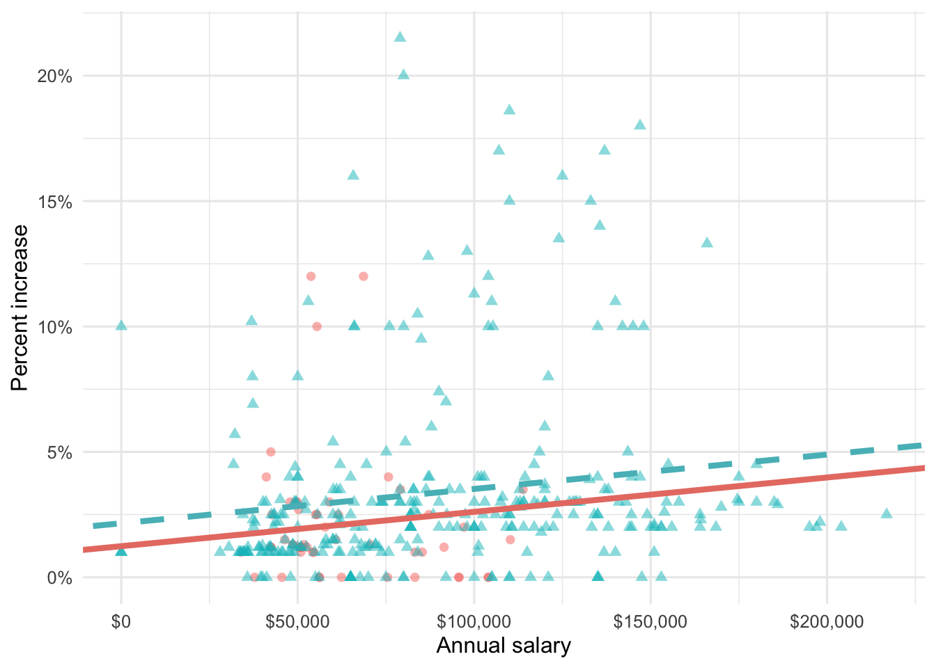 - For every additional $1,000 of annual salary, the raise goes up by 0.0155%.
