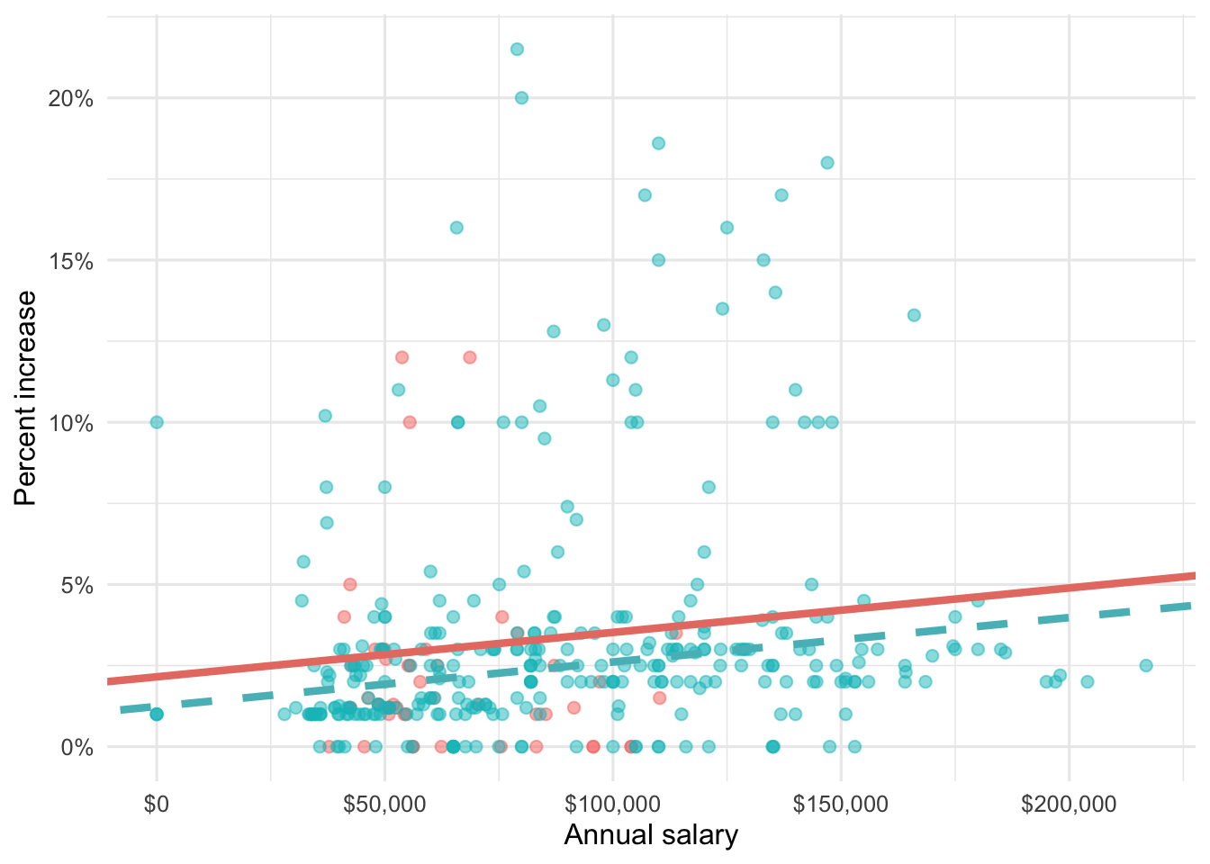 - For every additional $1,000 of annual salary, the model predicts the raise to be higher, on average, by 1.55%.