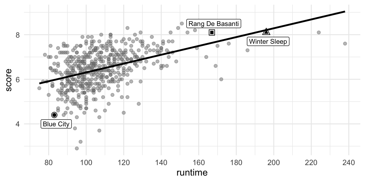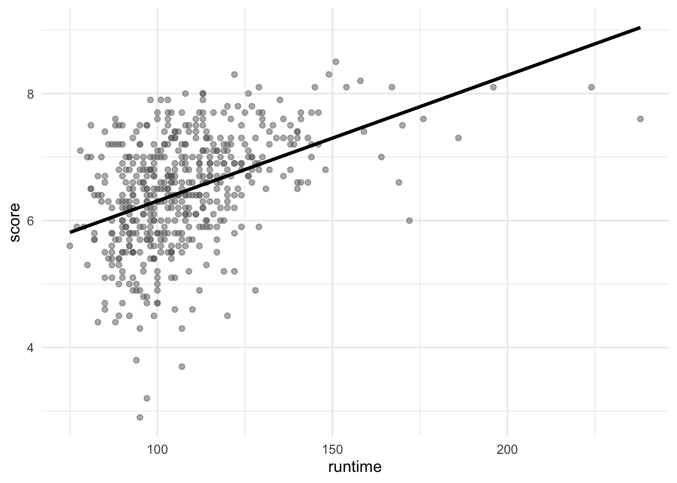 \(\widehat{score} = 4.525 + (0.021 - 0.257) \times runtime\)