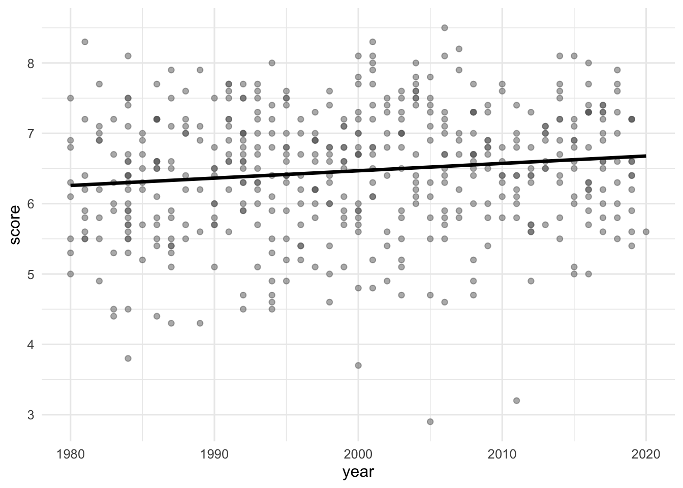 The visualizations below show the relationship between score and runtime as well as score and year, respectively. Additionally, the lines of best fit are overlaid on the visualizations.