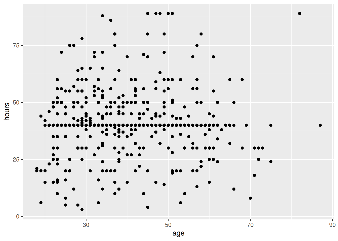 Suppose you want to estimate the correlation between hours (number of hours worked in week before survey, truncated at 89) and age (age at time of survey, truncated at 89).