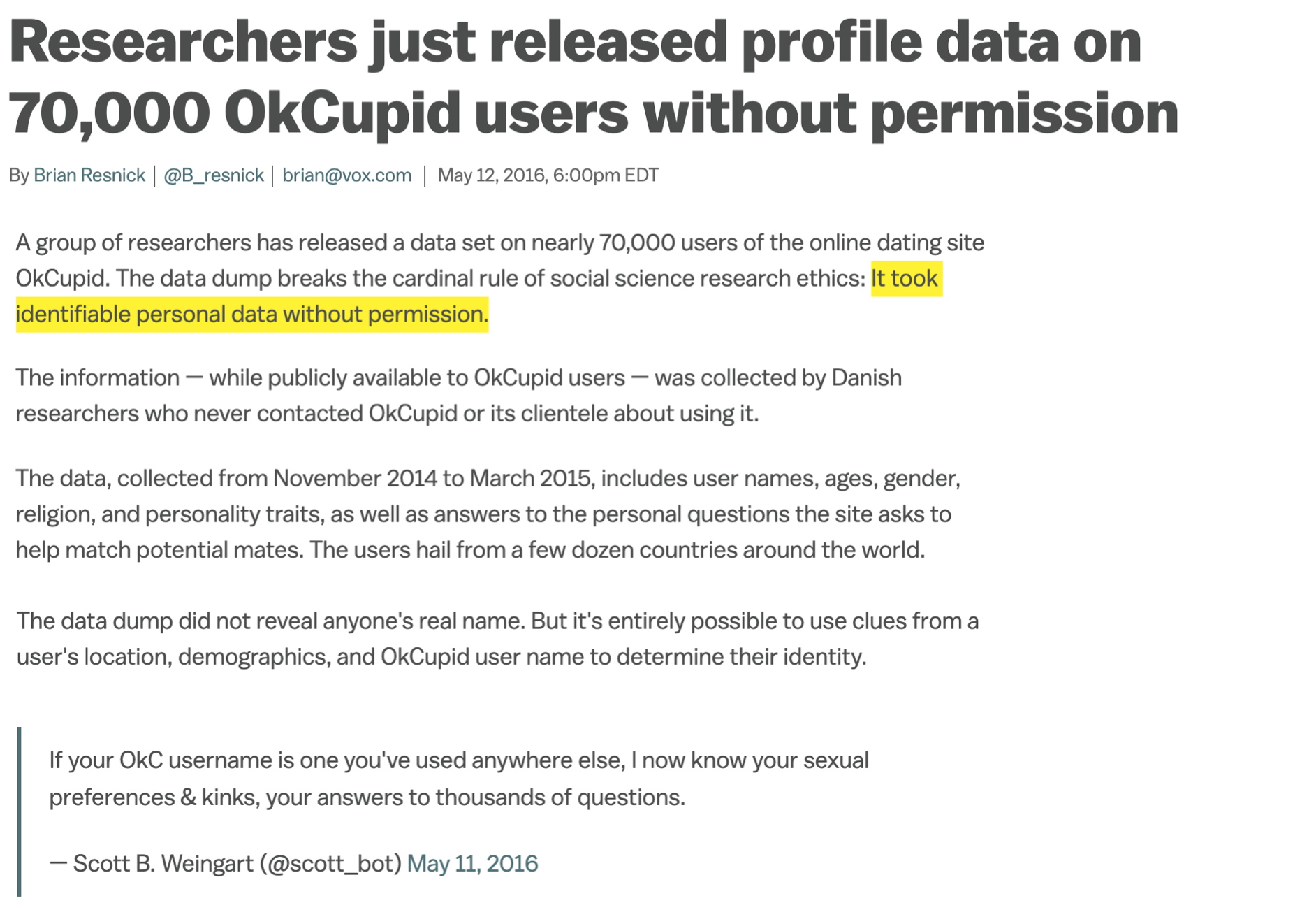 Source: Brian Resnick, Researchers just released profile data on 70,000 OkCupid users without permission, Vox.