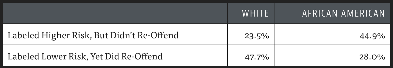 Source: Julia Angwin, Jeff Larson, Surya Mattu, and Lauren Kirchner. Machine Bias. 23 May 2016. ProPublica.
