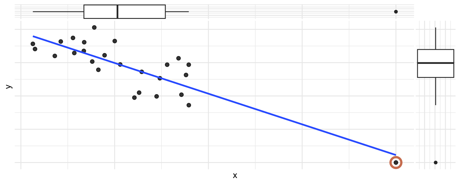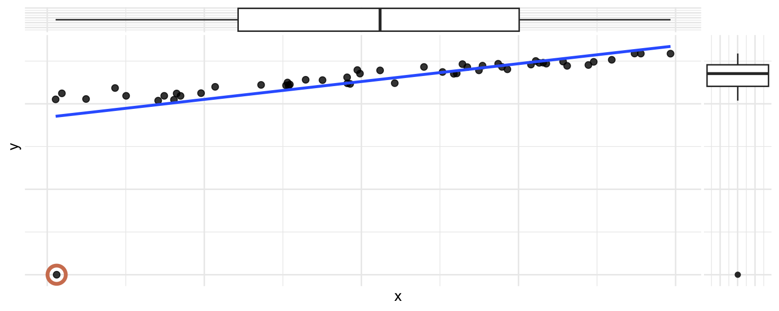 - It’s an outlier in both \(x\) and \(y\) but does not influence the regression line