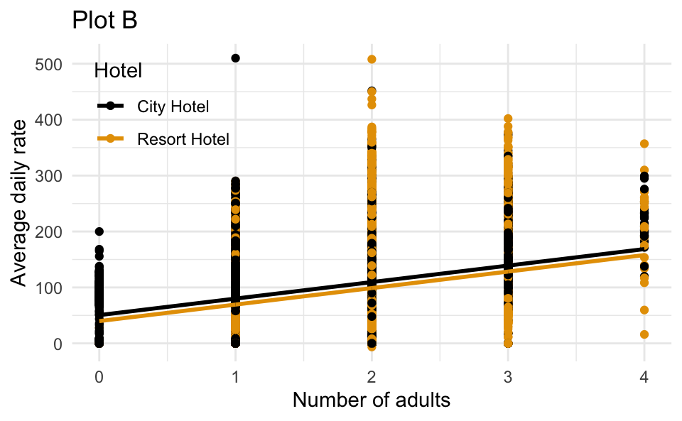 - For each additional Resort Hotel booking, the predicted average daily rate is $10.70 lower, holding number of adults constant.